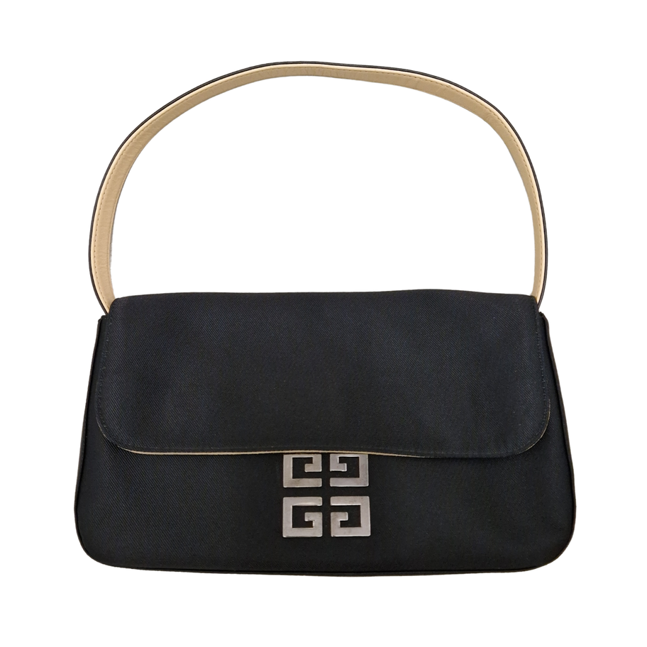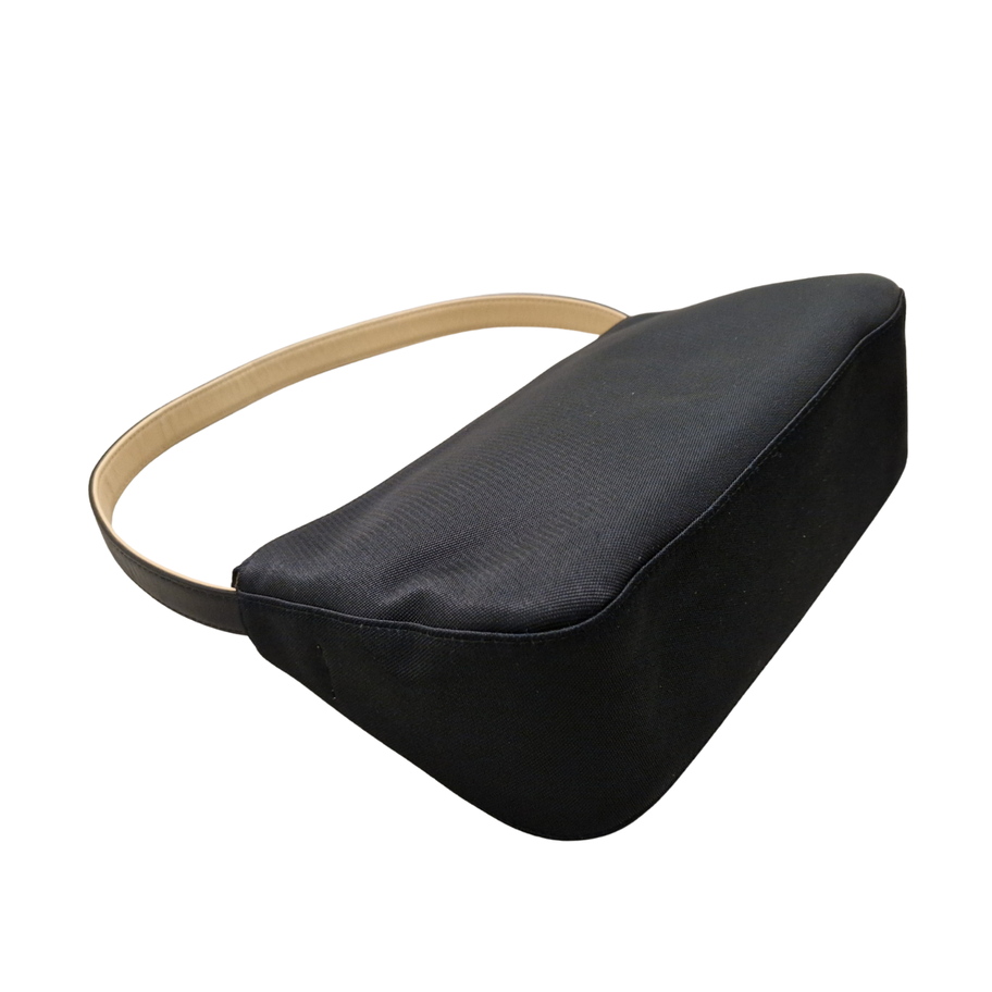 Schwarzer Nylon-Stoff mit beigem Innenfutter, 1 grosses Innenfach, 1 kleines Seitenfach mit Reissverschluss