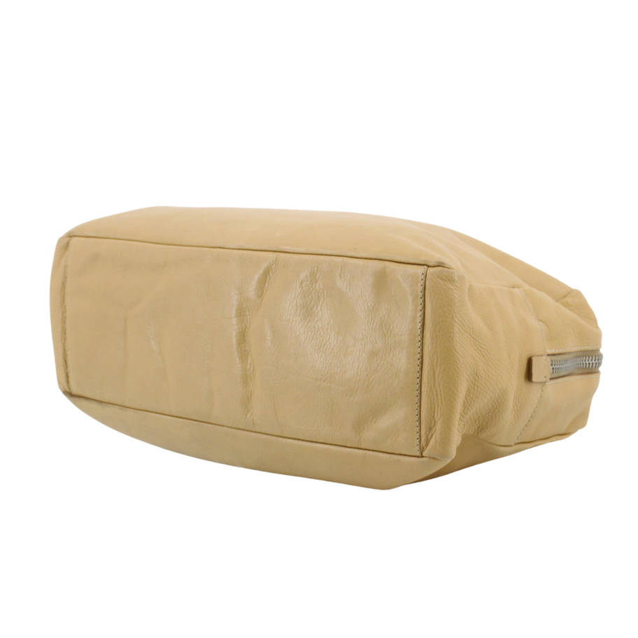 Beiges Glattleder, silberfarbene Hardware, 1 grosses Innenfach, 1 kleines Seitenfach mit Reissverschluss (innen)
